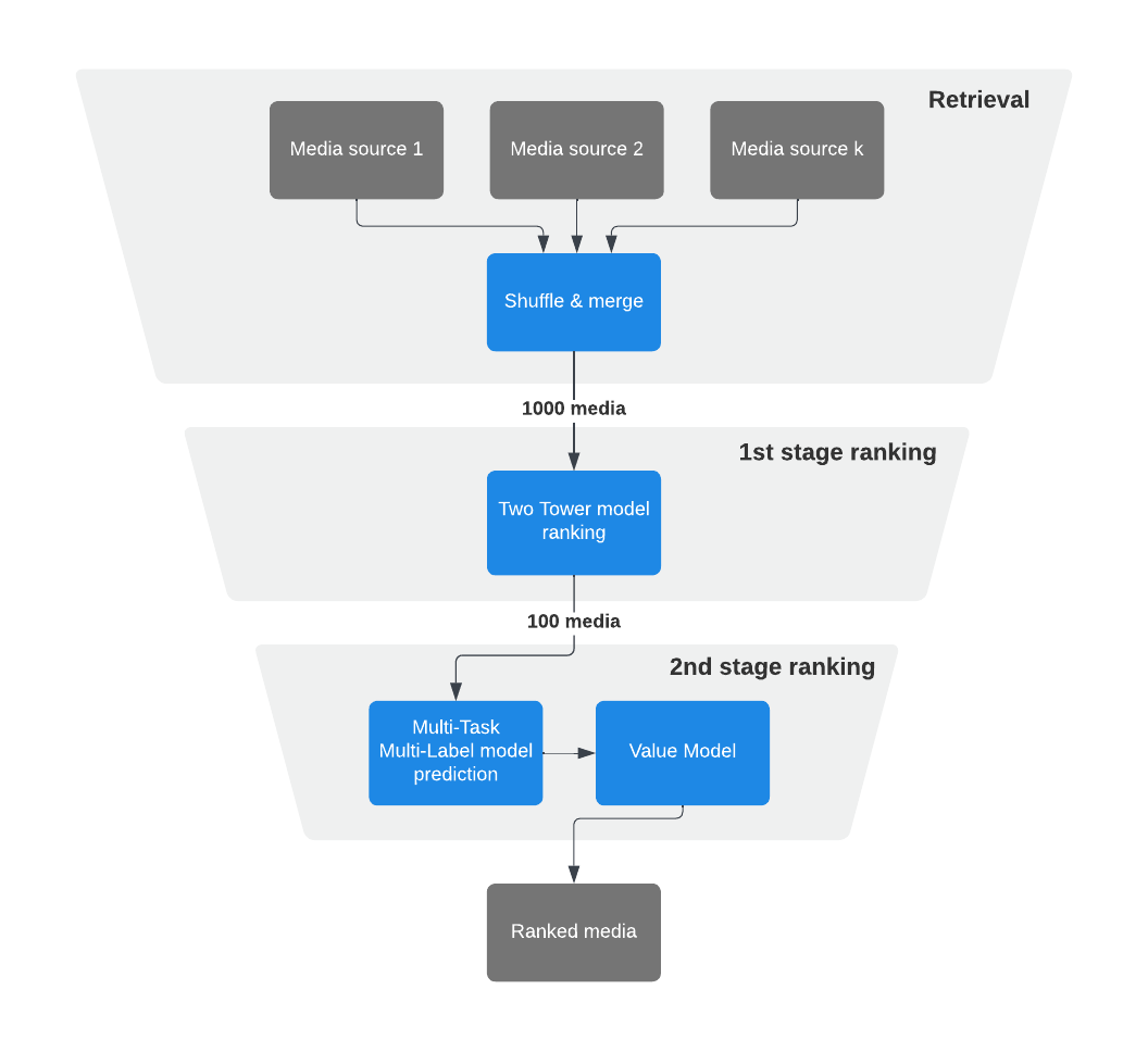 - Retrieval — Pull tens of thousands of candidates out of billions of pieces of content (fast filtering)
